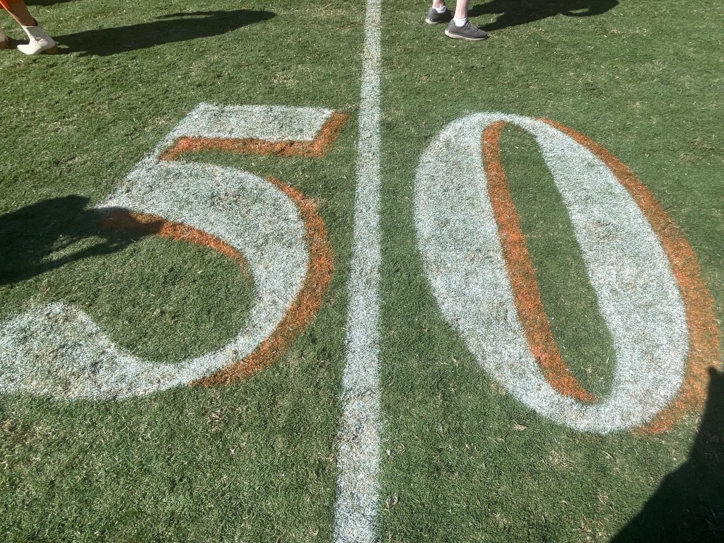 Johnie and Doug have excellent seats – about 9 rows up from the field in the end zone opposite the very big scoreboard…