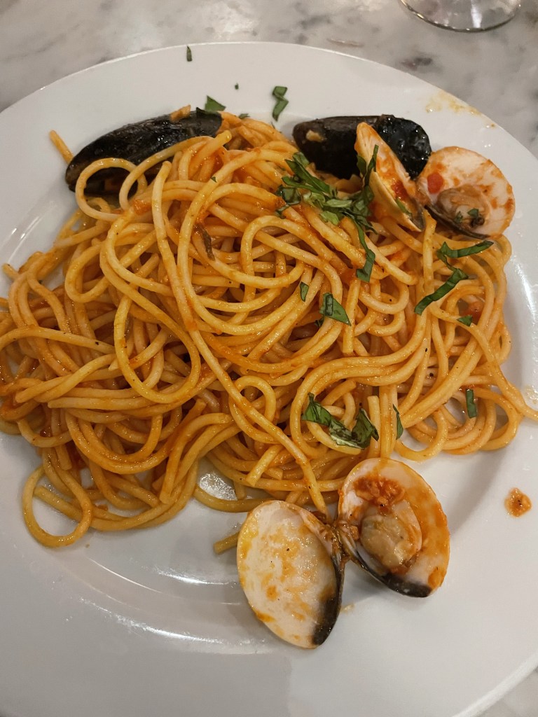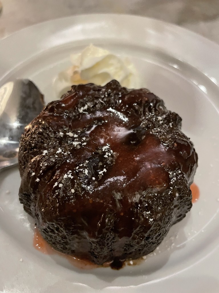 They served us several courses including a salad, linguine, fettuccine, spaghetti with seafood (when I told our waiter I liked fish), lasagna, penne Alfredo, meatballs, pizza, pork loin and we finished with sharing a molten chocolate cake and generous red wine pours. Didn’t photograph each course but here’s the seafood pasta and the molten chocolate cake.