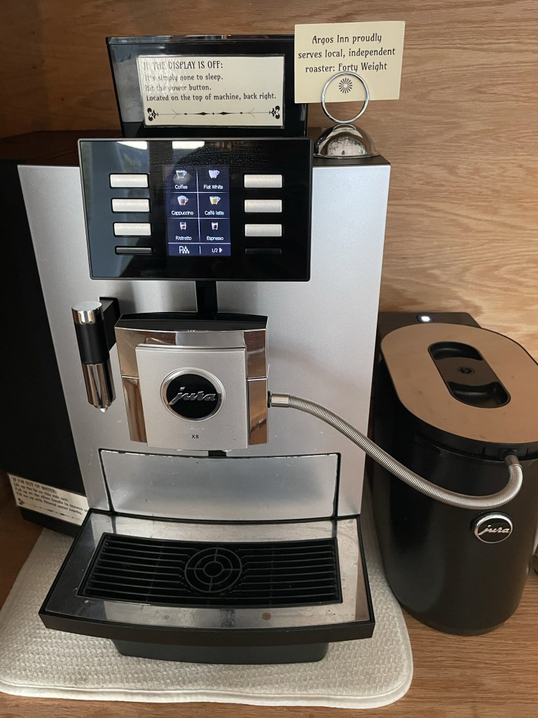 But first, we needed our morning coffee. The Inn has a cool coffee machine on the ground floor in a large conservatory-like room with lots of light and actual live plants.